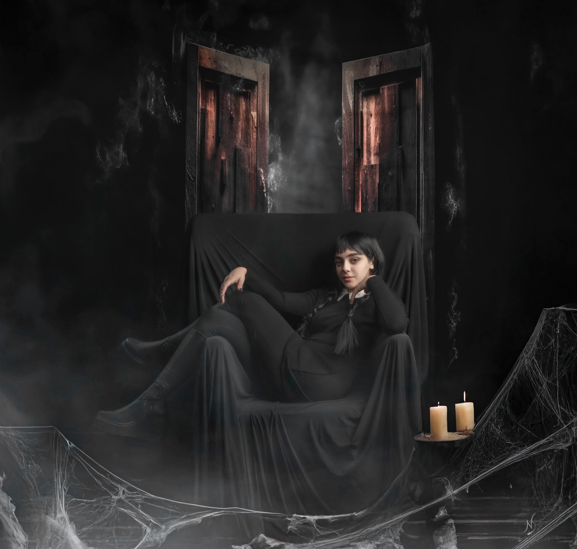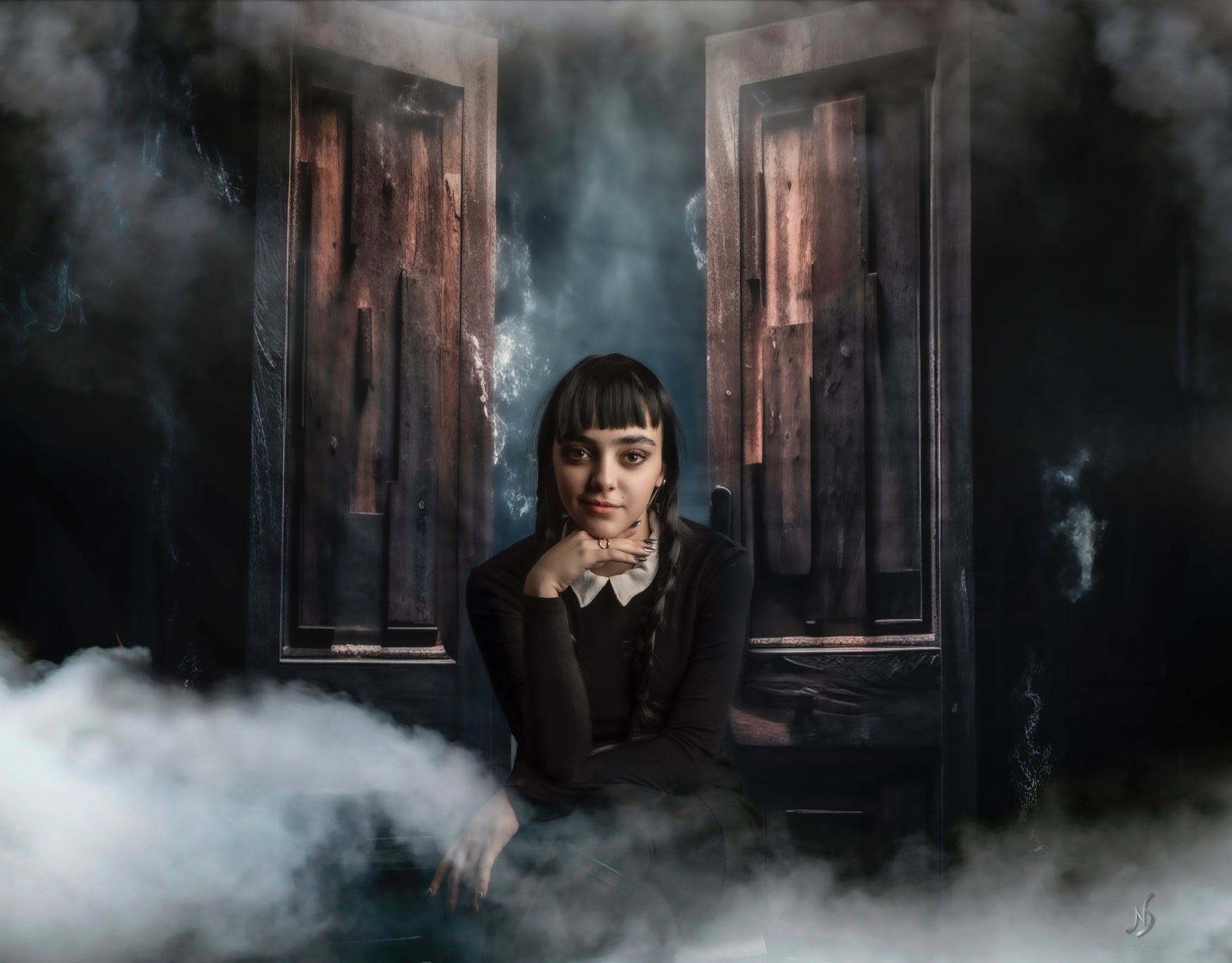 Toile de fond de fumée d'Halloween et de porte en bois d'Avezano pour la photographie