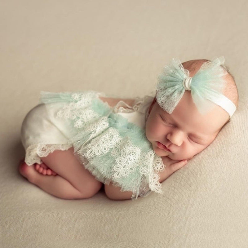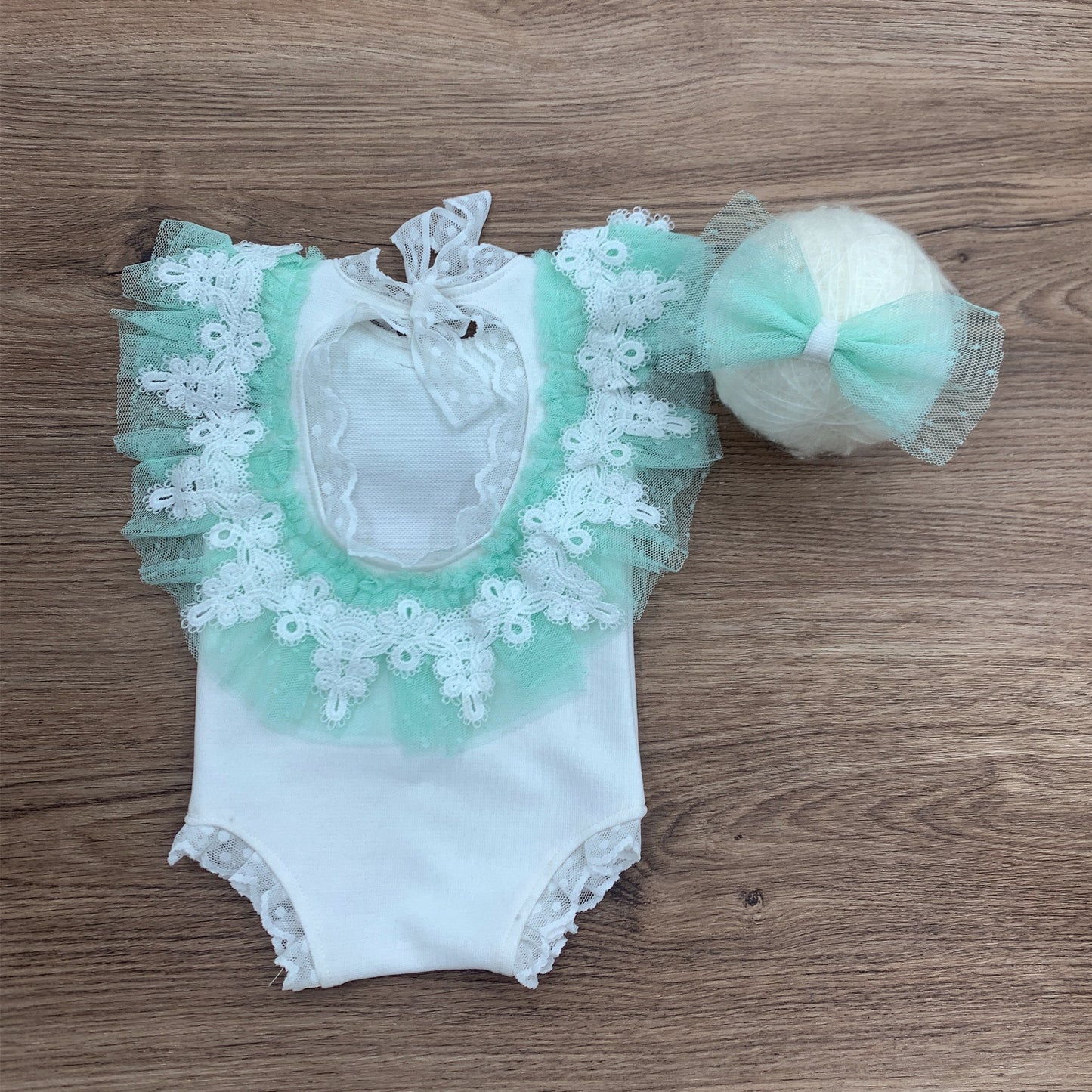 Costume tricoté Avezano en dentelle plissée à pois bleus pour nouveau-nés
