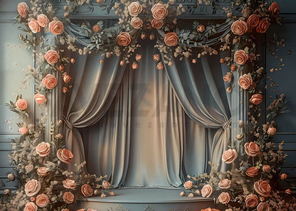 Toile de fond pour photographie printanière de roses roses et de rideaux Avezano