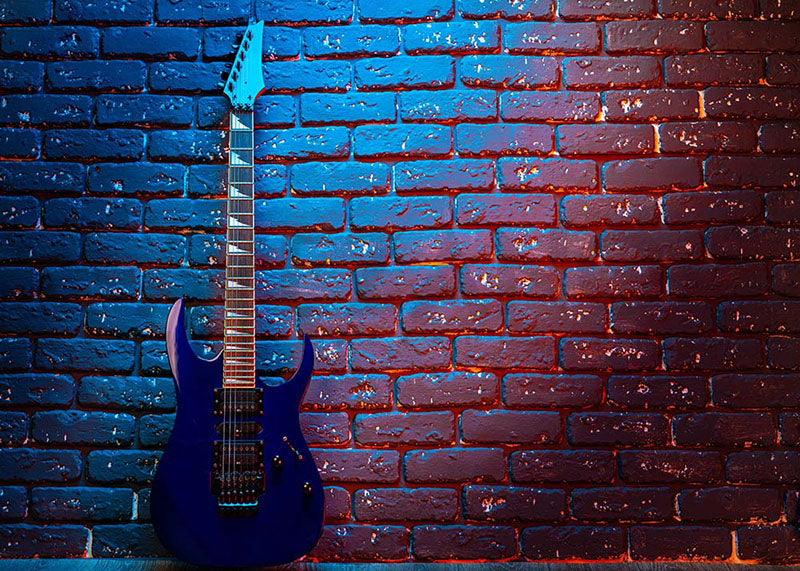 Guitare violette Avezano et arrière-plan de photographie de mur de briques rouges
