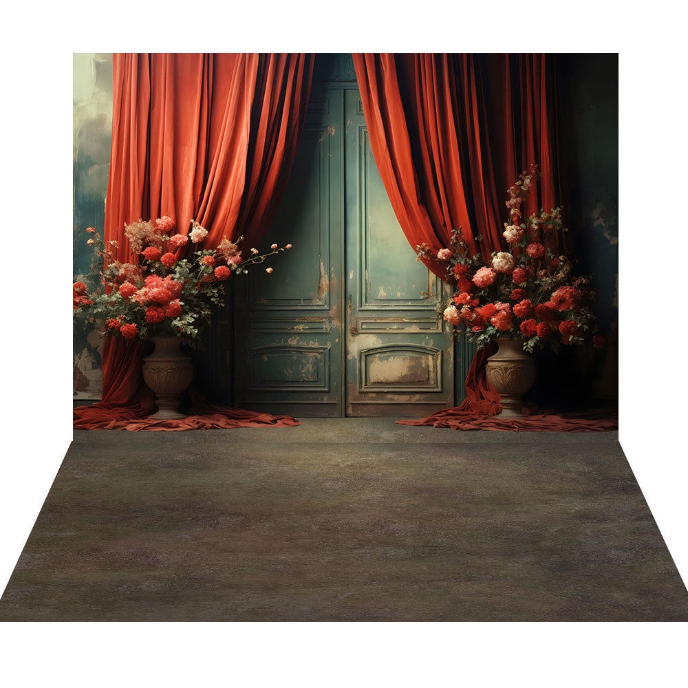 Rideaux rouges Avezano et portes en bois vertes, ensemble de 2 pièces, toile de fond