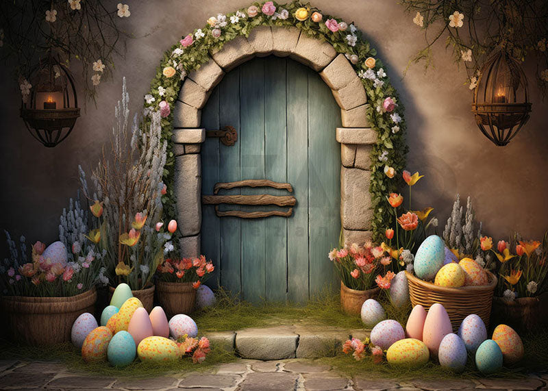 Toile de fond pour photographie de la porte et des œufs de Pâques au printemps d'Avezano