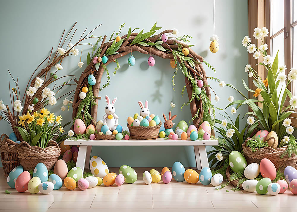 Toile de fond pour photographie d'œufs de Pâques et de décorations d'arbres de printemps d'Avezano