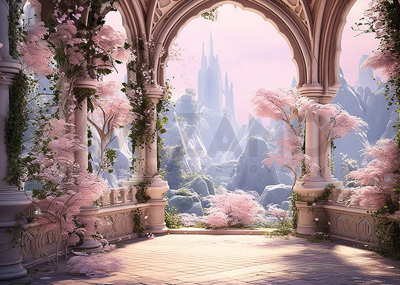 Toile de fond pour photographie de bâtiments roses printaniers d'Avezano