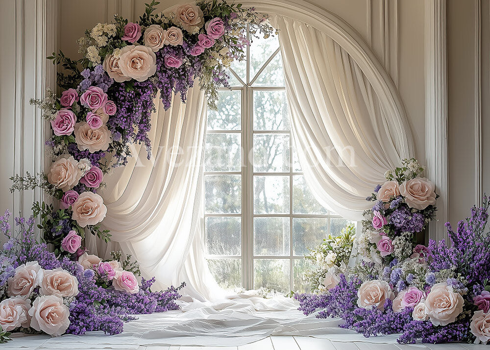 Toile de fond pour photographie de rideaux blancs et de fleurs violettes de printemps d'Avezano