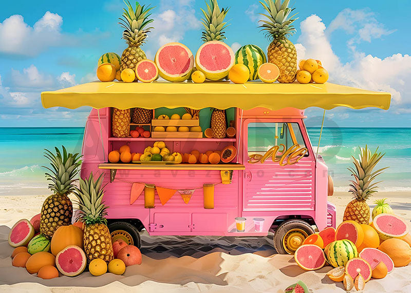 Toile de fond rose pour photographie de chariot de fruits sur la plage d'été d'Avezano