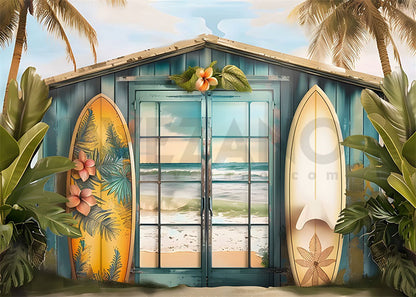 Planche de surf sur la plage d'été d'Avezano et toile de fond pour photographie de la maison bleue