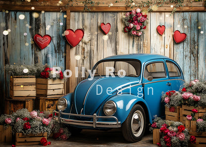 Toile de fond pour photographie de la Saint-Valentin Avezano avec voiture bleue et roses conçue par Polly Ro Design