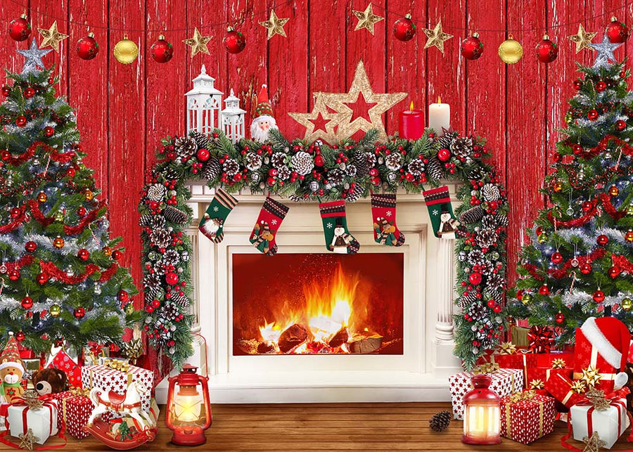 Avezano Christmas Red Wood Wall Fireplace Trees Gifts Backdrop For Photography