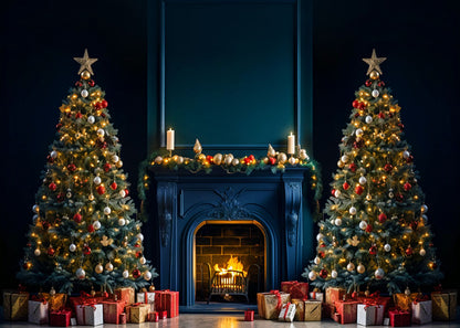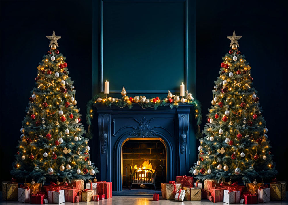 Avezano Christmas Tree and Blue Fireplace Photography Backdrop