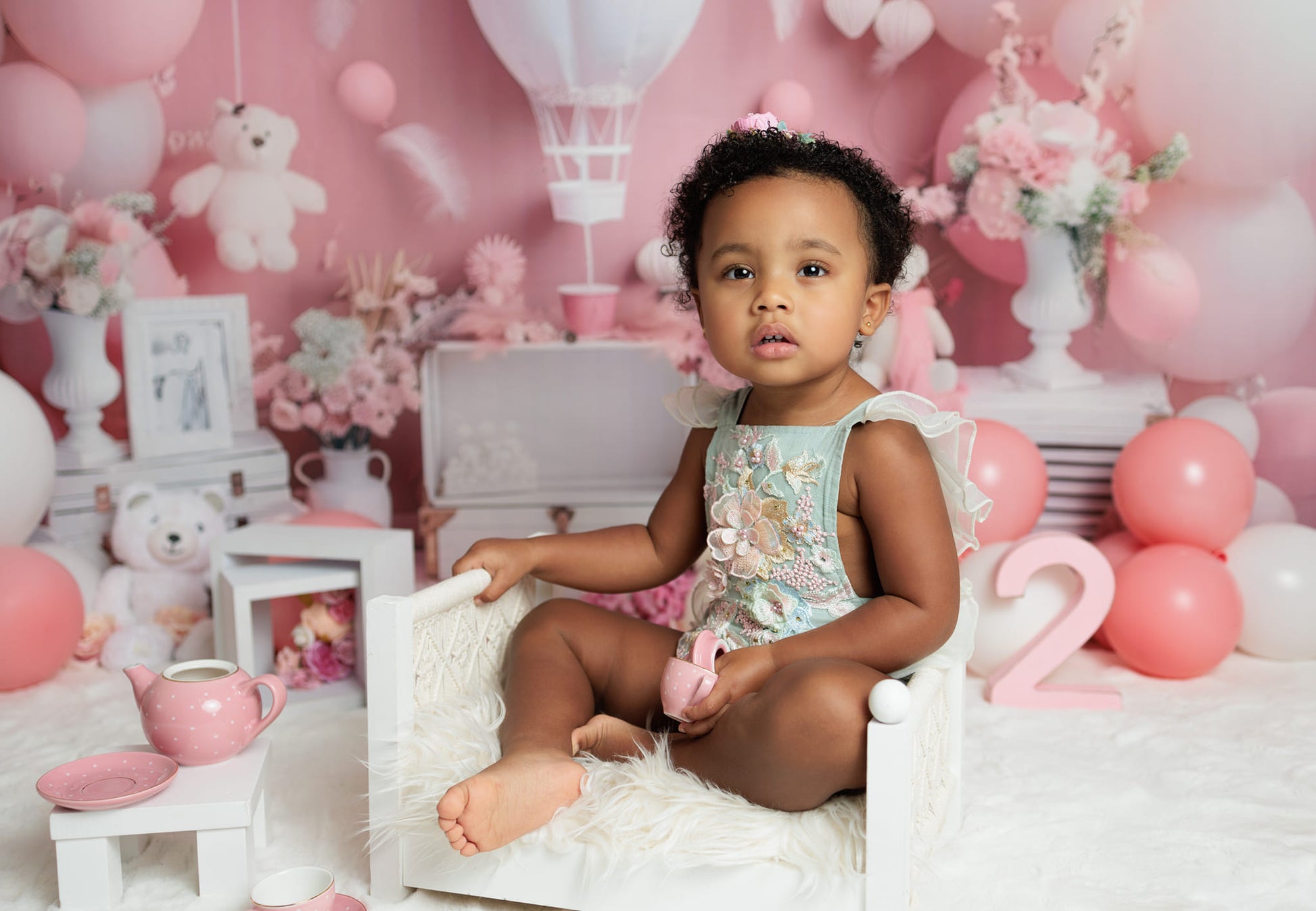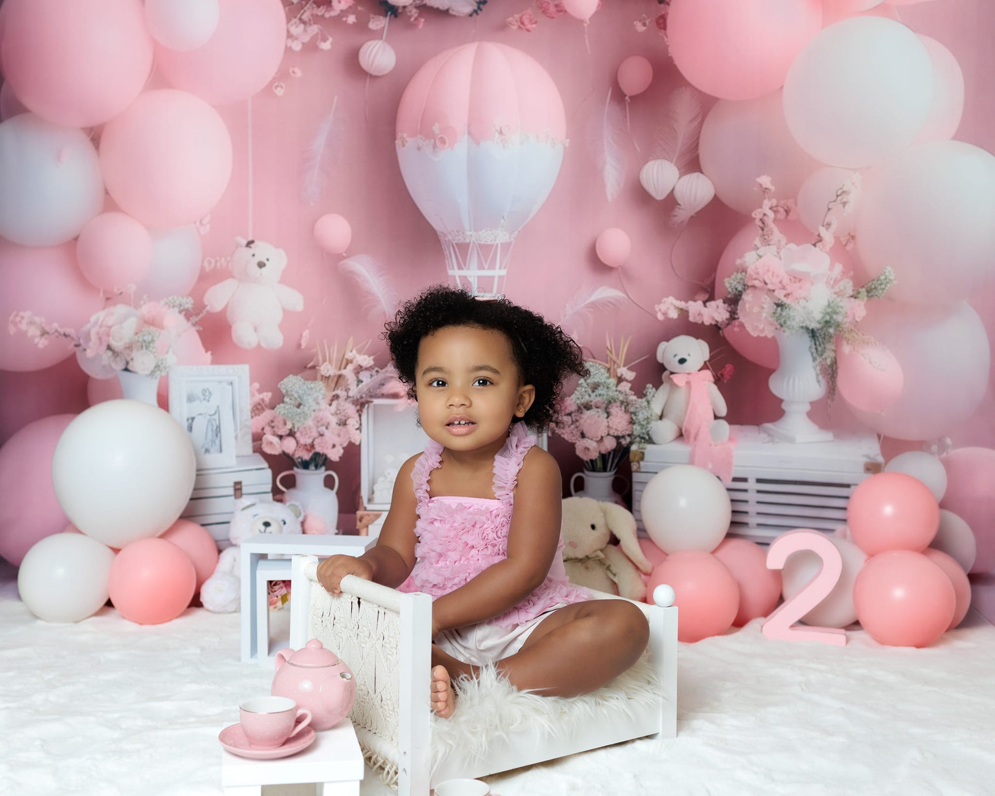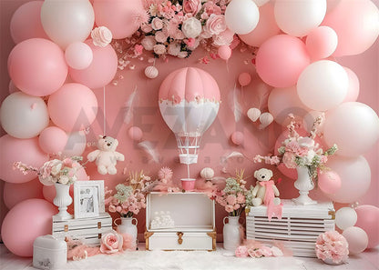 Avezano Pink Girl Flowers and Hot Air Balloons Birthday Party Photography Background