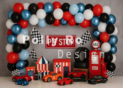 Avezano Race Car Pit Stop Red and Blue Balloons Photography Backdrop Designed By Polly Ro Design