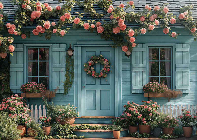 Avezano Spring Blue House Full of Flowers Photography Backdrop