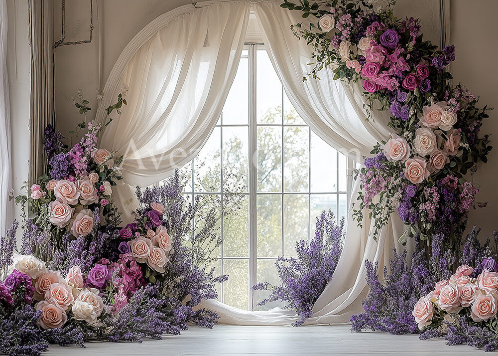 Avezano Spring Round Windows and Purple Flowers Photography Backdrop