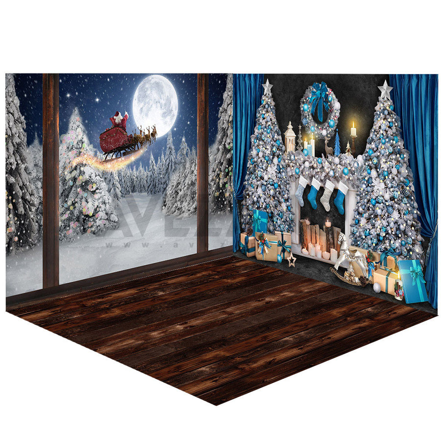 Avezano Winter Christmas Santa and the Christmas Tree Photography Backdrop Room Set